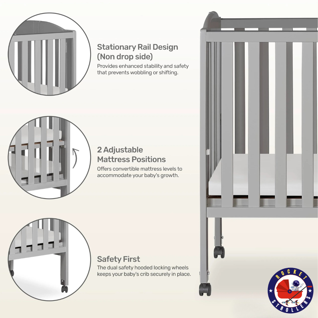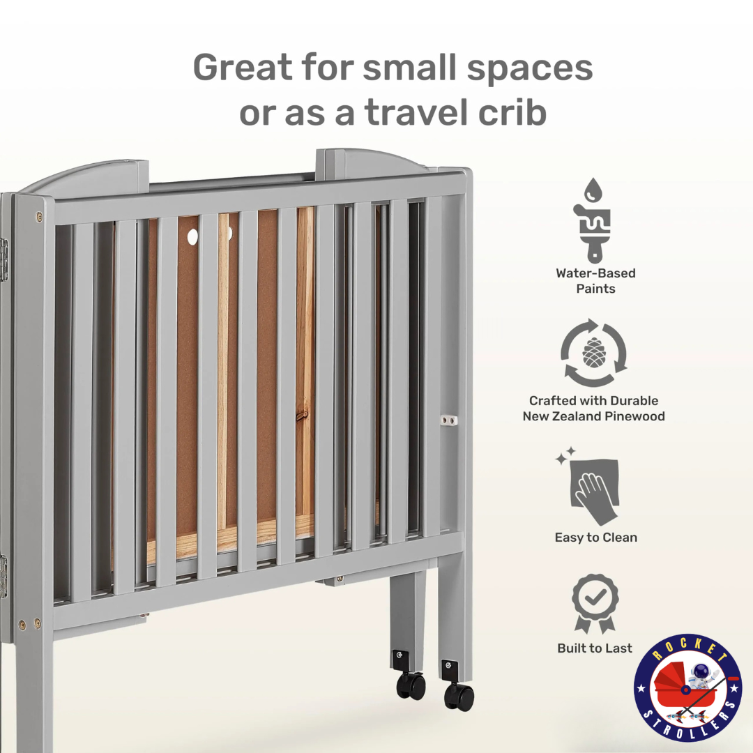 Compact and Portable: When the crib is not needed, simply fold it using the patented folding system and store it away, no disassembly required. Unfold and use again when needed! The lightweight frame and wheels allow you to easily move it from room to room.